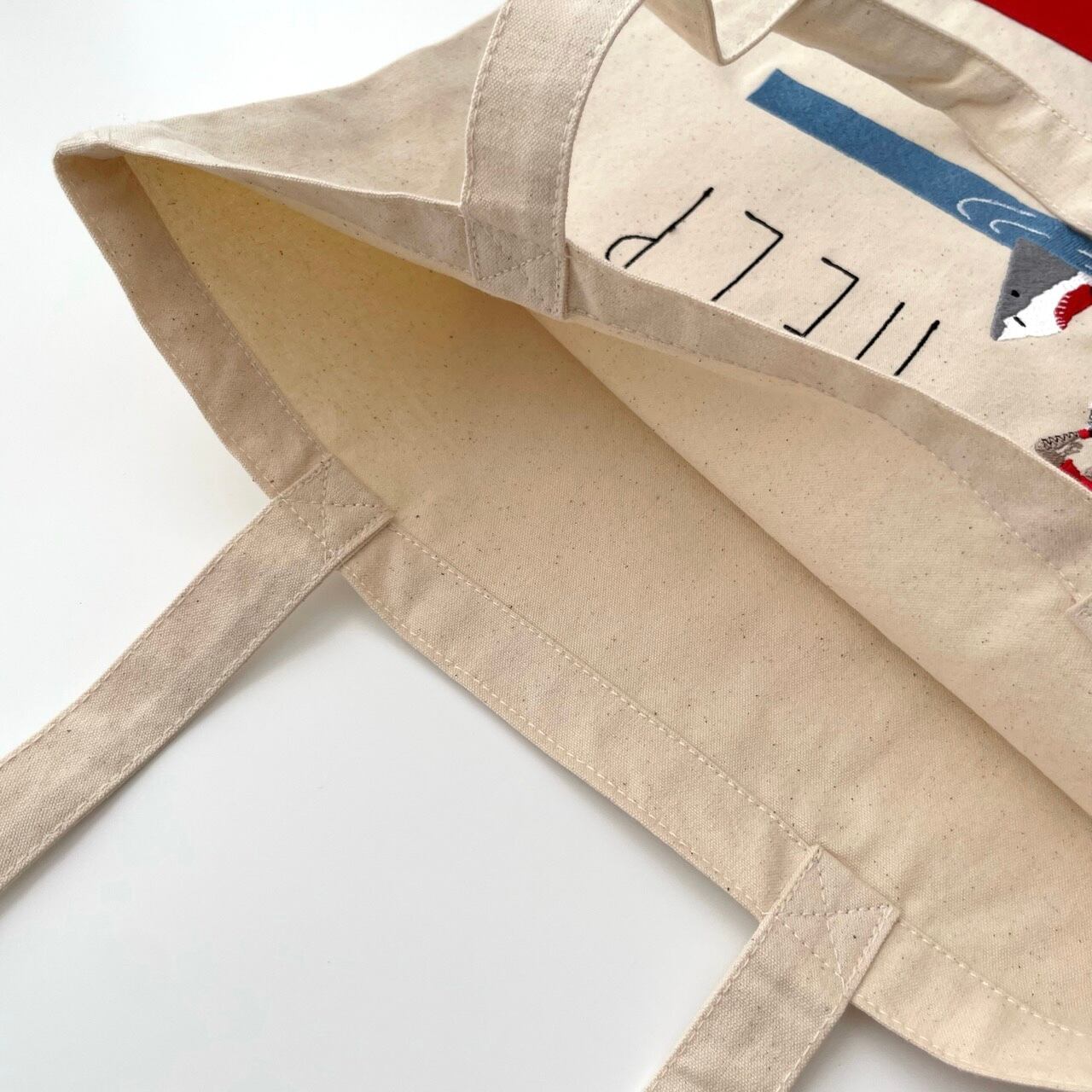 サイズ:タテ37cm×ヨコ24cm×底マチ12cm 持ち手55cm カラー:ナチュラル/赤 容 量:約10L 素 材:綿100%キャンバス 【注意点】 ・刺繍はミシン刺繍です。 ・お使いの端末や閲覧環境により、写真と実物の色味が多少異なって見えることがございます。ご了承ください。 【配送について】 クリックポスト(全国一律料金・追跡可)でお届けします。